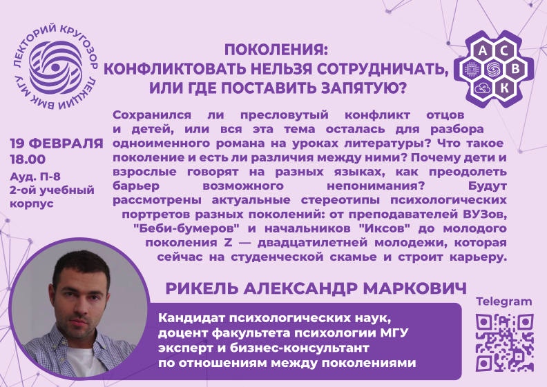 Про теорию поколений не утихают споры: есть ли пресловутые различия между этими Иксами и зумерами? Насколько эти различия научно обоснованны, или это выдумки талантливых маркетологов? Да, и, вообще, сохранился ли пресловутый конфликт отцов и детей, или вся эта тема осталась для разбора одноименного романа на уроках литературы? В рамках нашего разговора мы познакомимся со свежими исследованиями психологических портретов разных поколений современных россиян, пройдемся по актуальным стереотипам и поймем, какие из них подтверждаются в научных исследованиях, а какие — нет, узнаем, почему дети и взрослые говорят на разных языках, подумаем, как преодолеть барьер возможного непонимания.